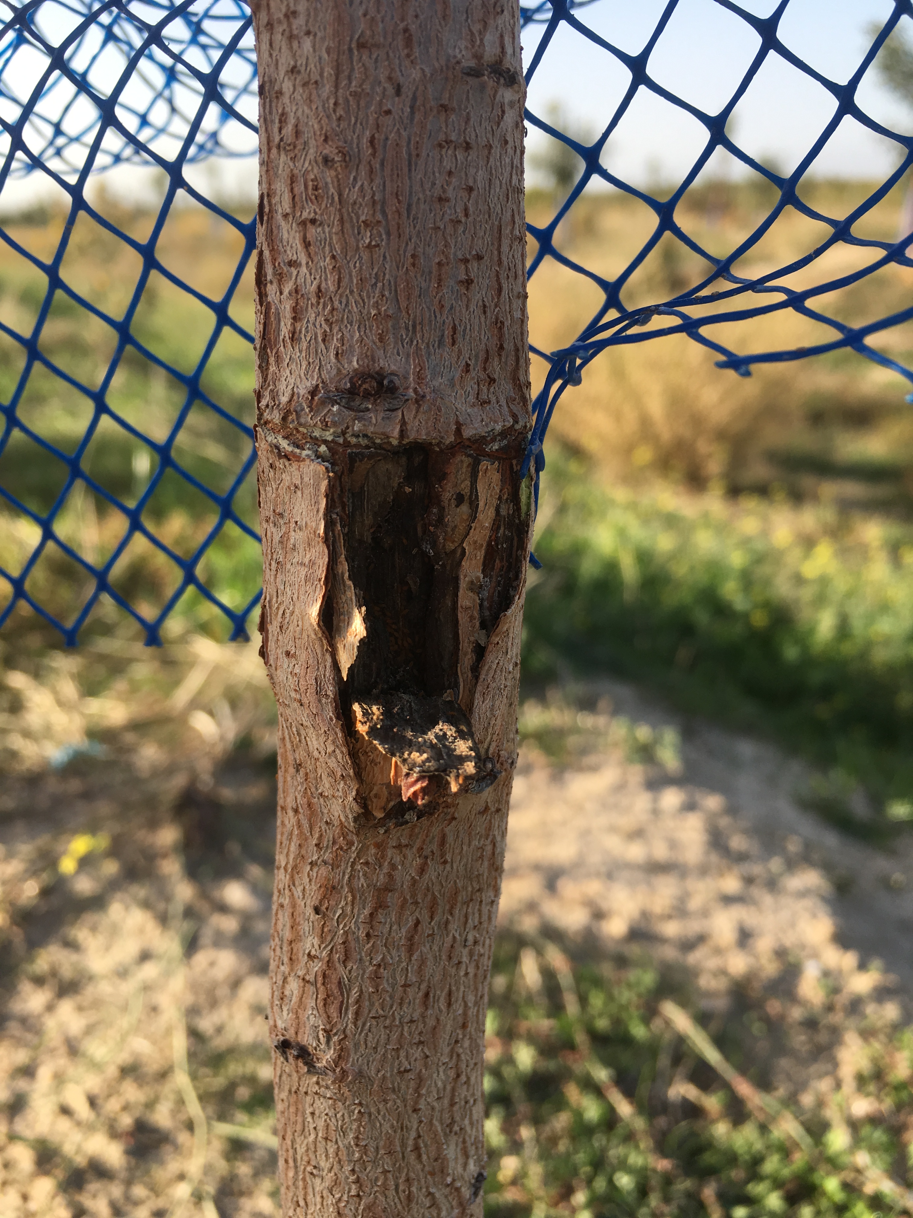 En el pistacho según las informaciones que tenemos en el Chaparillo y según nuestras averiguaciones y hipótesis, podría ser posible que este insecto ataque los injertos infiltrandose entre la yema y la madera del portainjerto causando daños como en foto. (Gracias a Juan Carlos de Caceres por las fotos)